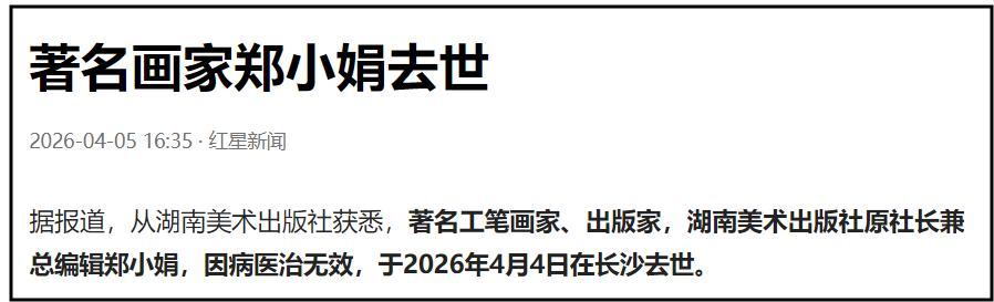 據媒體報道,鄭小娟因病醫治無效,於2026年4月4日在長沙去世,享年85歲。