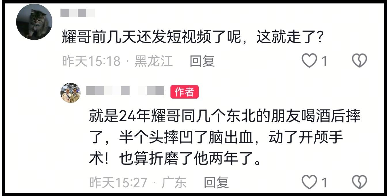 據李道瑜的朋友透露,2024年李道瑜和幾位東北朋友聚會後回家,因爲醉酒摔倒了,撞到了後腦,昏迷了6天,做了開顱手術。