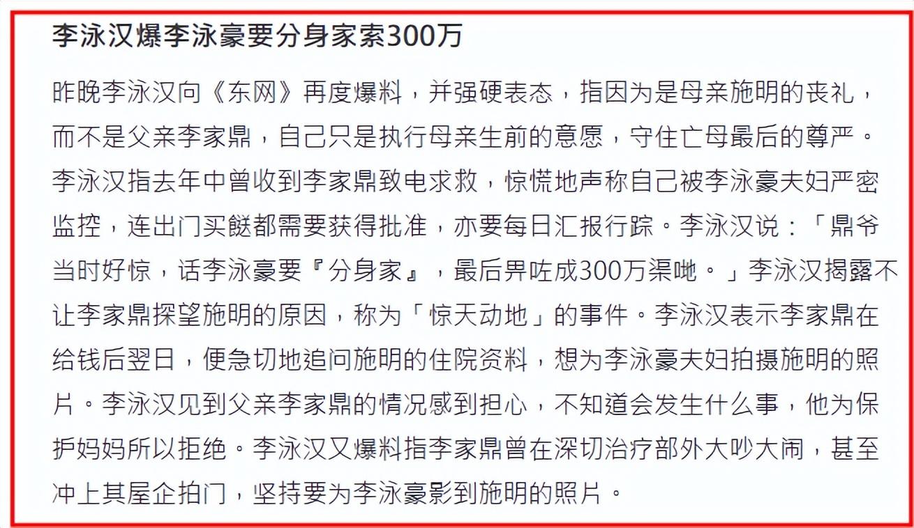 更炸裂的是,李泳漢還爆料說李泳豪要求父親“分身家”,找李家鼎要了300萬港幣。