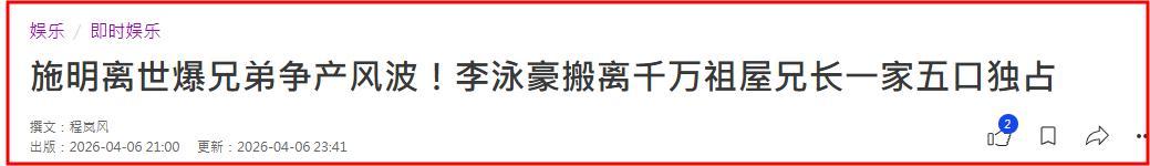 此外,港媒報道稱隨着施明去世,李泳漢李泳豪兄弟陷入了爭產風波。