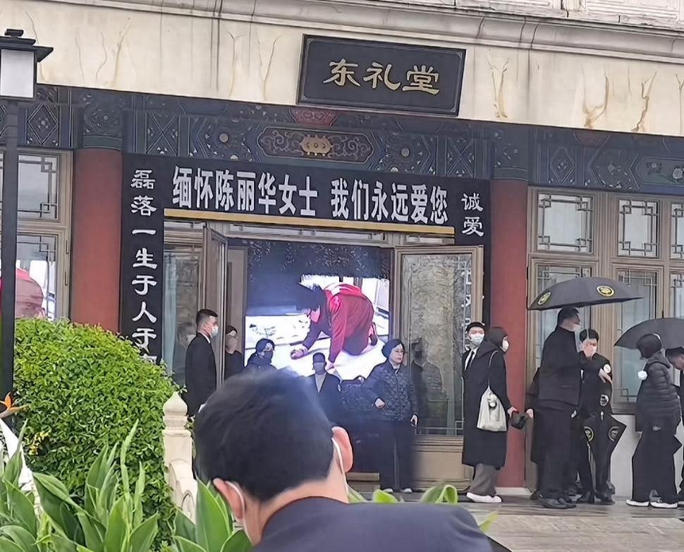 靈堂內的電子屏幕上播放着陳麗華生前的影像。