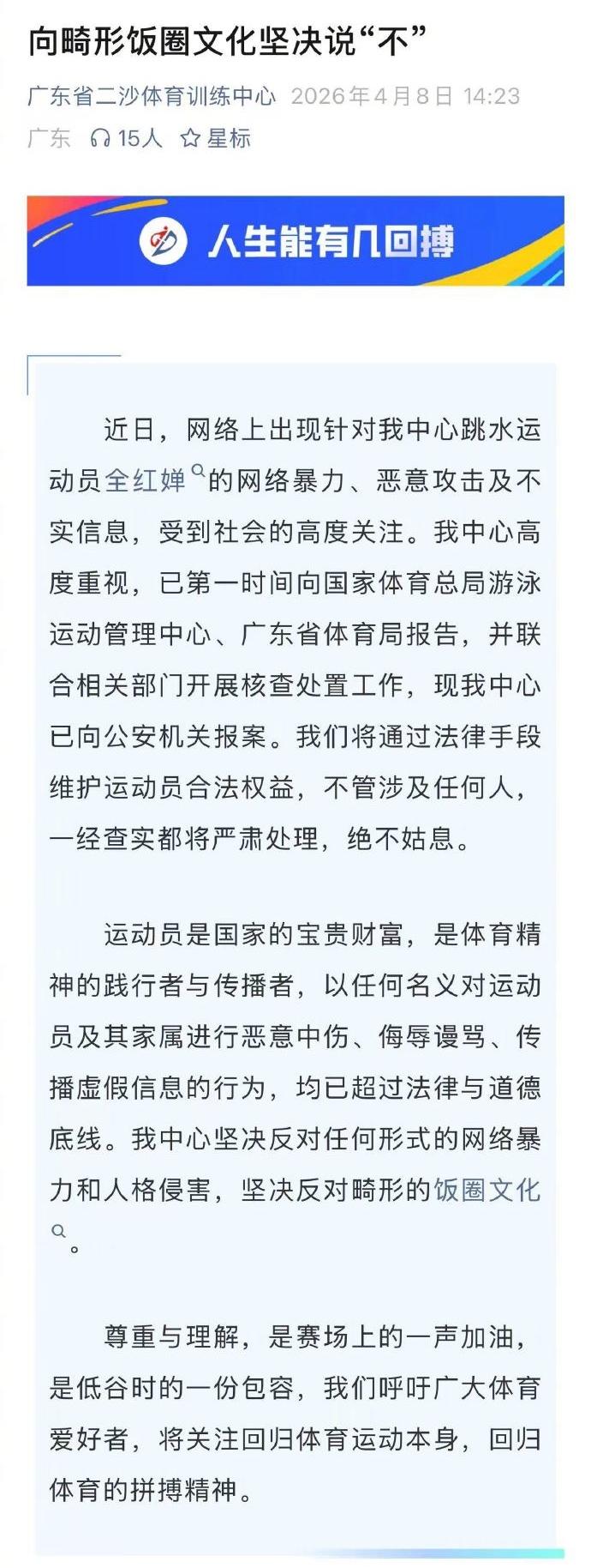 4月8日,全紅嬋所在的廣東省二沙體育訓練中心發文稱已就全紅嬋涉嫌被網暴一事報警,將通過法律途徑堅決追究網暴者責任。