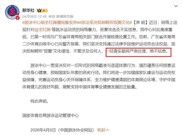 在廣東省二沙體育訓練中心發文後,國家體育總局游泳運動管理中心便很快跟進發聲,直言堅決抵制畸形“飯圈”文化,對任何網絡暴力和惡意攻擊行爲將嚴肅處理,絕不姑息。