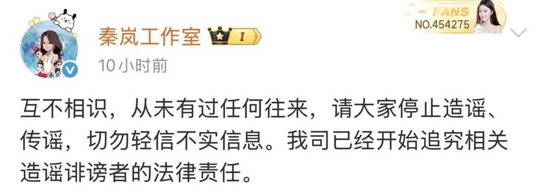 不過,注意到網絡輿論後,秦嵐方面發文闢謠了,直言不認識金子涵,也沒有任何往來。
