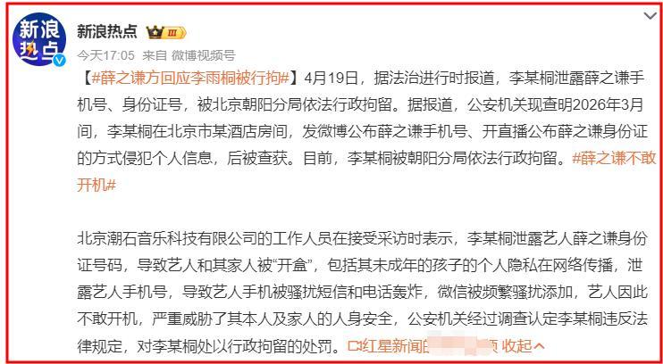 突發!李雨桐被行拘10日,違法行爲曝光,薛之謙方面透露細節
