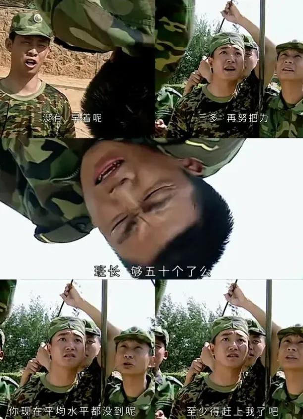 還有《士兵突擊》裏王寶強的名場面,許三多做腹部繞槓訓練時,用力過猛,帽子不小心掉了。