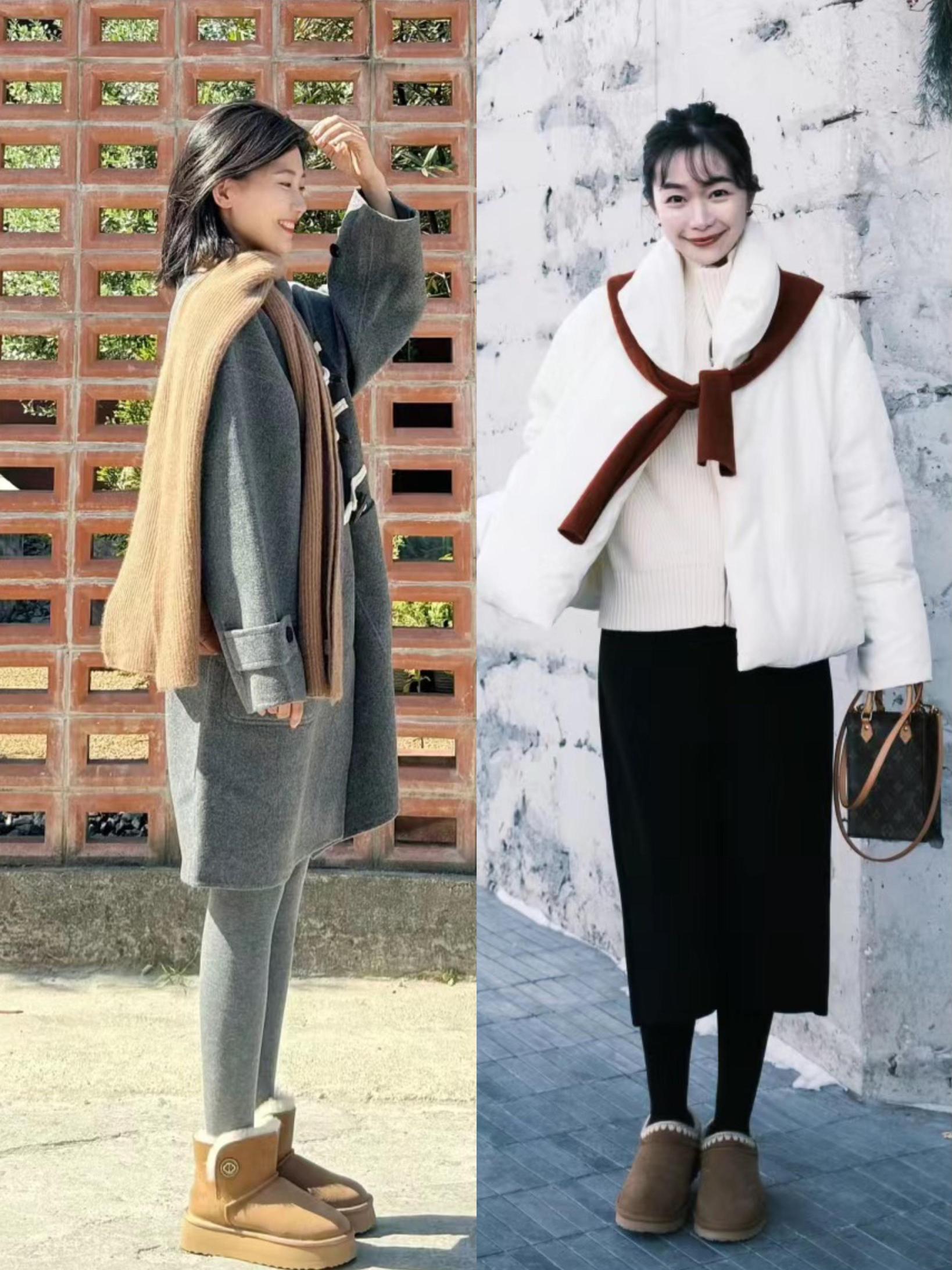 天氣寒冷的時候,我們還是要準備一雙雪地靴。相對於時裝靴、雪地靴的保暖性自然是遙遙領先。如果搭配褲子,或者想要更修飾腿型,我們可以選擇短筒的雪地靴。