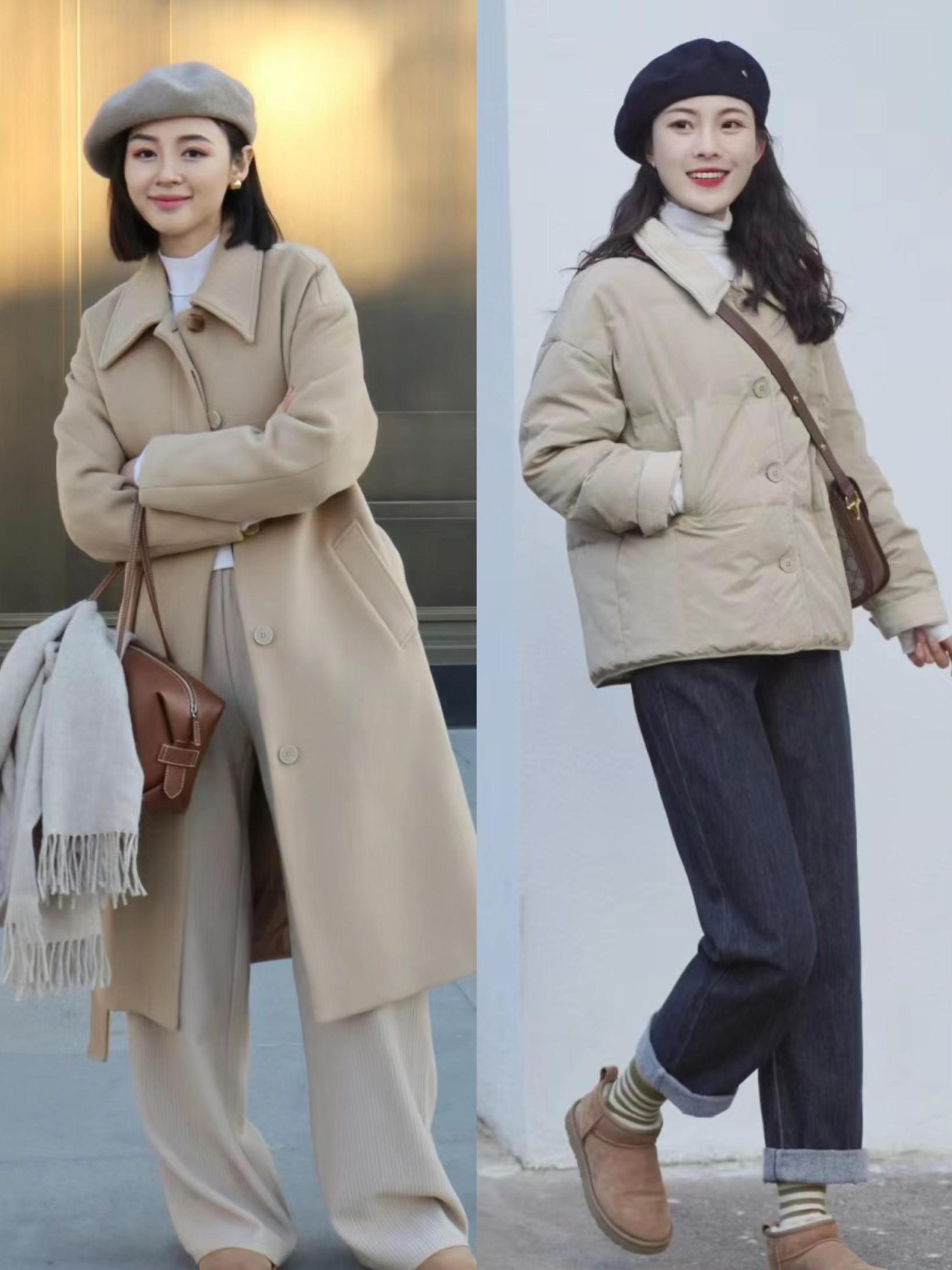 想要更好的優化身材比例,我們可以直接照搬這樣一組穿搭。短款的羽絨服,可以配高腰的直筒闊腿褲,上短下長的組合,就非常利落顯高。