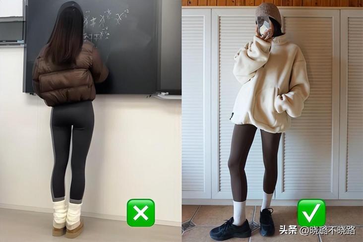 走在大街上不難發現大家會選各種各樣的冬服,它是上半身擋風有保暖的基礎,即使是顯瘦的冬服都不會像夏季的上衣一樣有輕薄感。會穿的素人會利用寬窄的差異,當然不是穿打底褲,而是提臀顯瘦面料有光澤的瑜伽褲。
