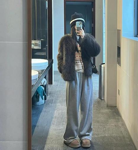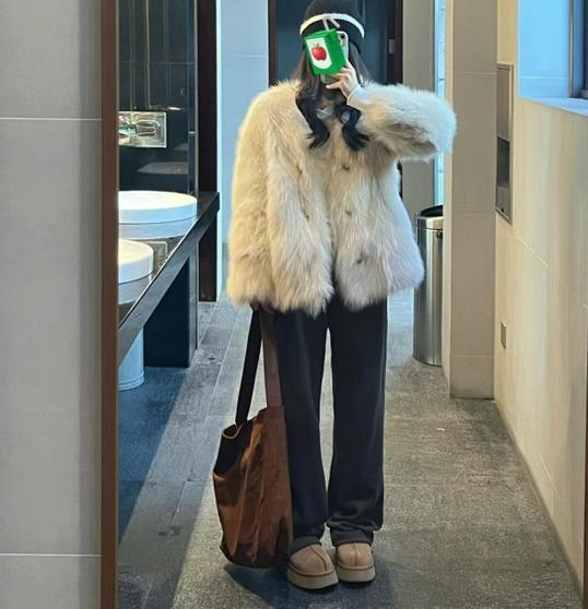 毛絨短外套,擔心會穿出顯臃腫效果的,可以敞開穿,同時下身搭配的褲子要選垂感好的,版型寬鬆一些。