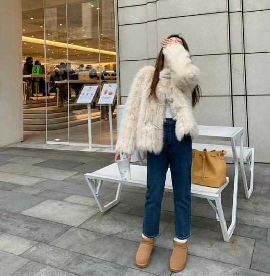 毛絨絨的外套,穿起來就非常溫暖啊,這個杏色也很溫柔,小短款,個矮的身材最合適。搭配直筒版型九分牛仔褲,真的很顯瘦,視覺上顯高顯瘦,腿看起來也非常筆直。