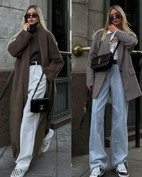 對於梨形身材的姐妹來說,版型直筒或闊腿這兩種褲子是很合適的,不過一定要注重褲子面料質感。