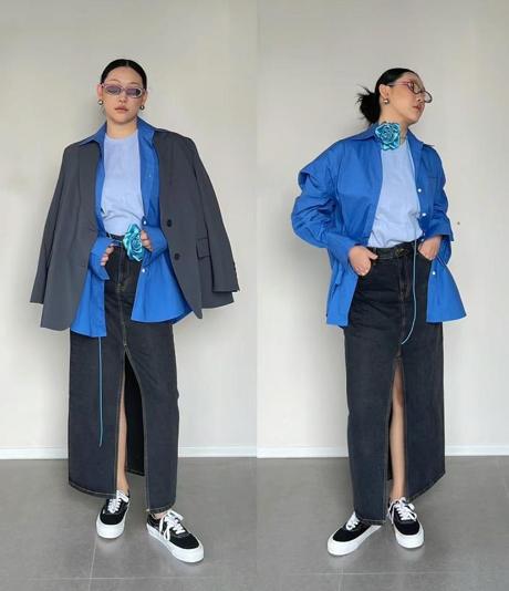 微胖+蘋果形身材的穿搭,上身利用起疊穿,西裝+襯衫+t恤,很適合通勤和休閒的穿法,打造層次感又時髦。下身配的是一條高腰開叉牛仔半裙,記得要把腰線比例提高起來,這樣才能修飾小肚腩。