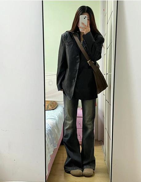 蘋果形的身材也可以穿很多漂亮的衣服,南方的姐妹,在秋冬可以穿皮衣+微喇褲,真的很顯瘦好看,也非常有氣質。