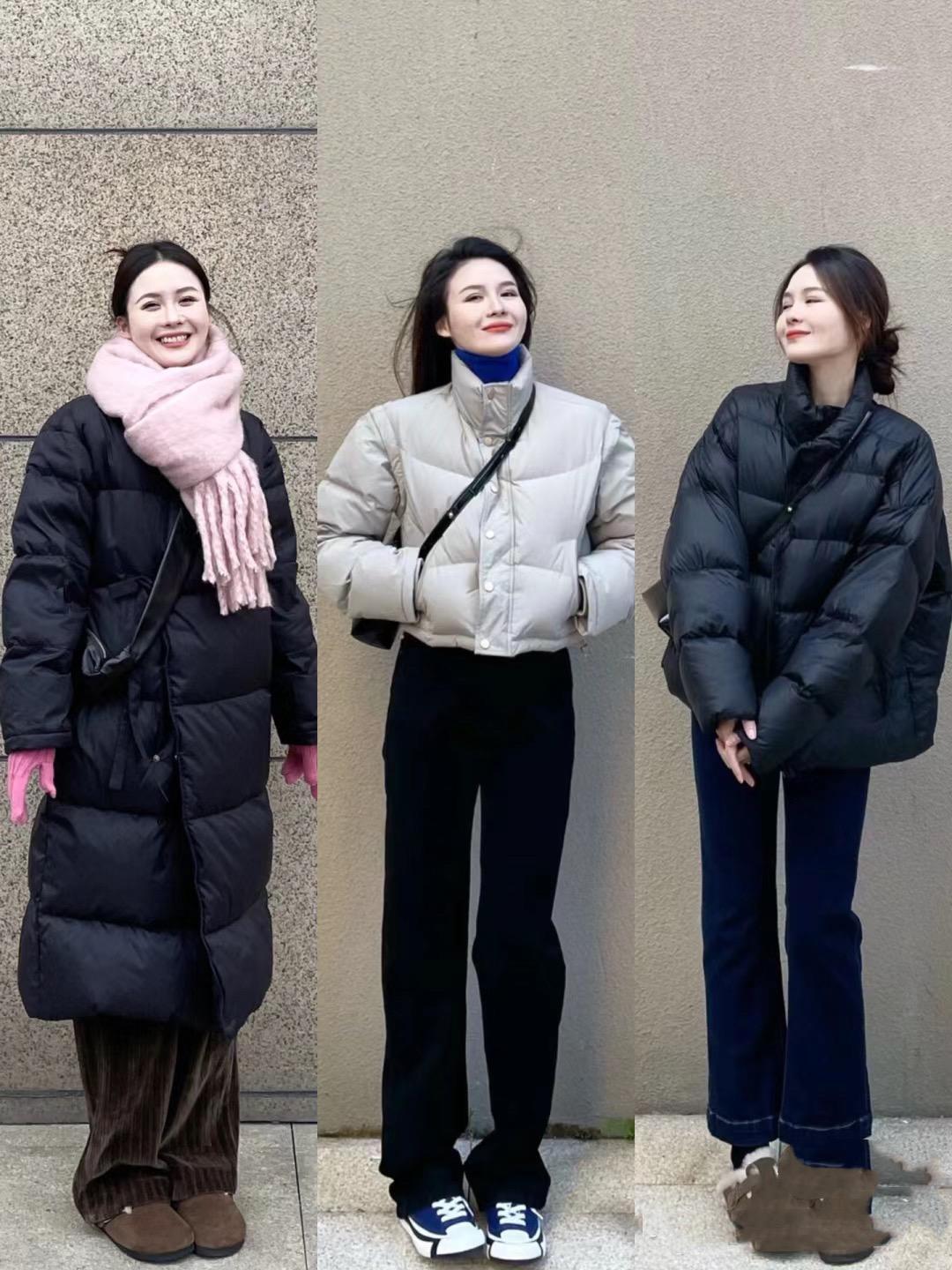 寬鬆的黑色/藏藍色羽絨服,都是一種比較內斂顯白的顏色,我們可以搭配緊身的鯊魚褲或者打底褲,可以形成更明顯的鬆緊對比。