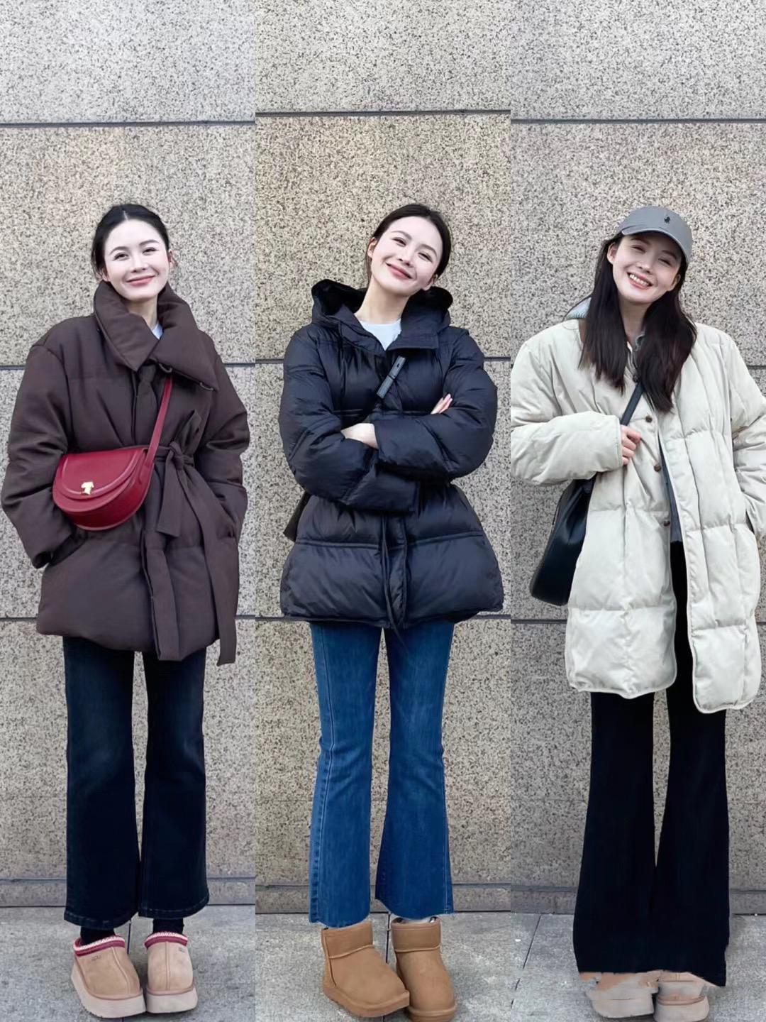 寬鬆的棉服或者羽絨服,都可以搭配修身效果比較明顯的高腰微喇褲。寬鬆一點的羽絨服,配上大腿處收緊的微喇褲,鬆緊對比的穿着方式不僅保暖還特別的顯瘦。
