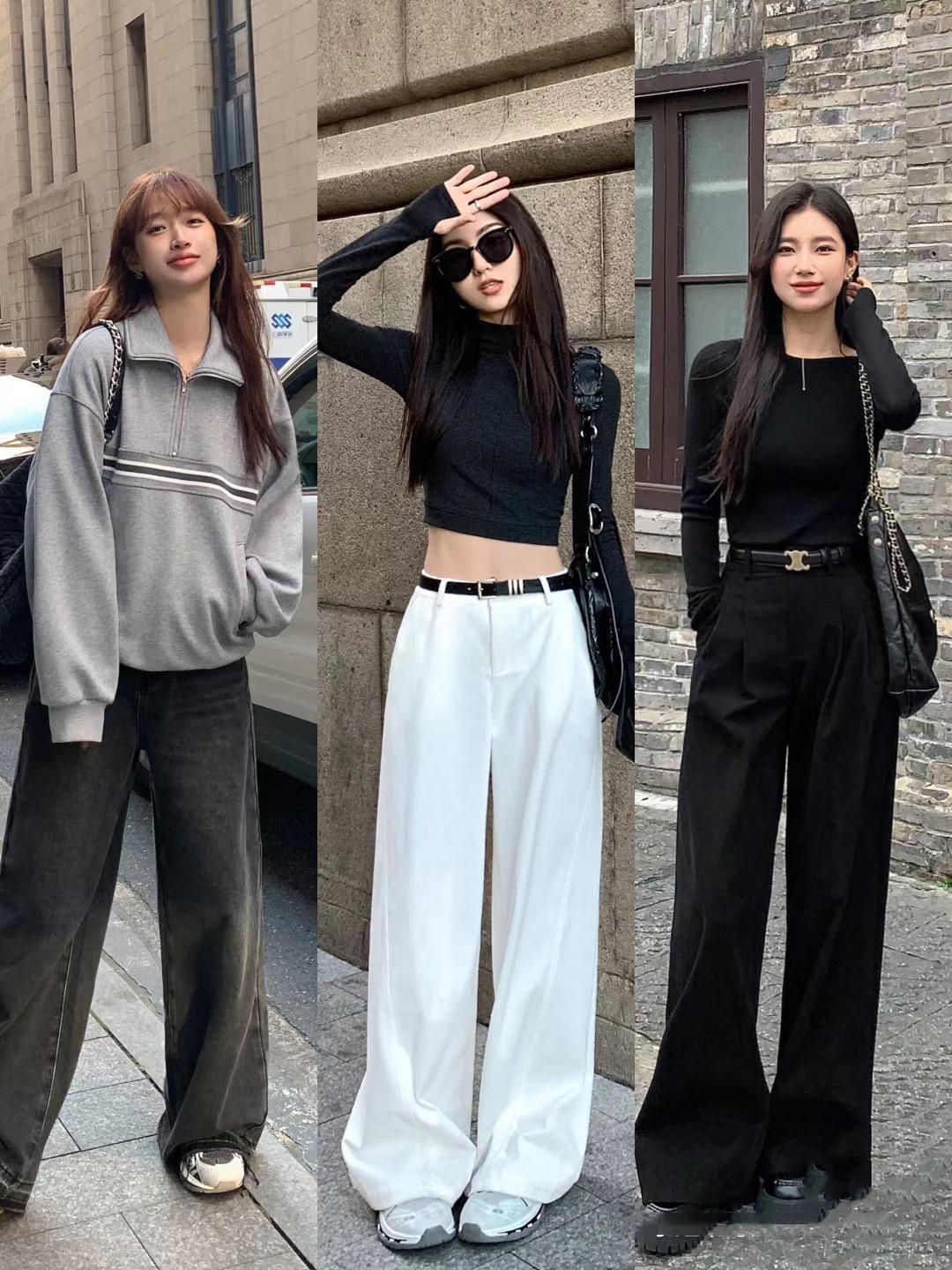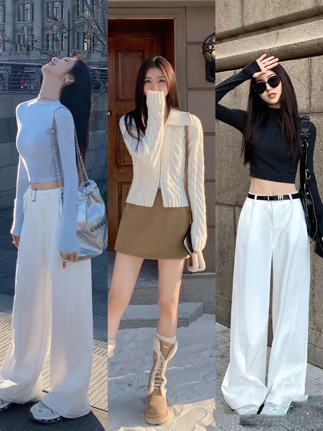 像這種經典的高腰闊腿褲,在韓系穿搭中黑色或者白色都是耐穿的。如果要清爽醒目的美,就搭配白色闊腿褲。如果要沉穩高級的美,就可以搭配黑色闊腿褲。