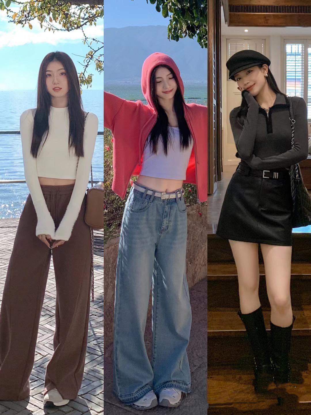 像這種露臍的針織衫,或者緊身的針織衫,搭配羊絨的面料親膚又保暖。我們配高腰闊腿褲的時候,也可以選擇加絨加厚的高腰闊腿褲,抬高腰線又顯得雙腿修長。