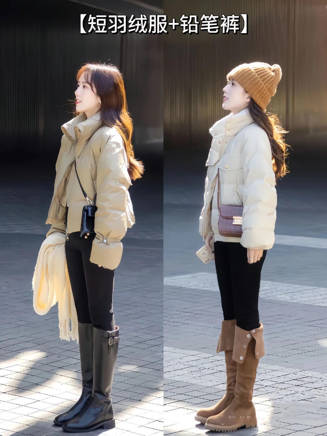 短款的羽絨服,配上高腰的鉛筆褲,利落又不邋遢。如果你是典型的小個子,而且雙腿比較筆直的話,冬天完全可以照搬鉛筆褲+短款羽絨服的組合,搭配厚底長靴更加時髦洋氣。