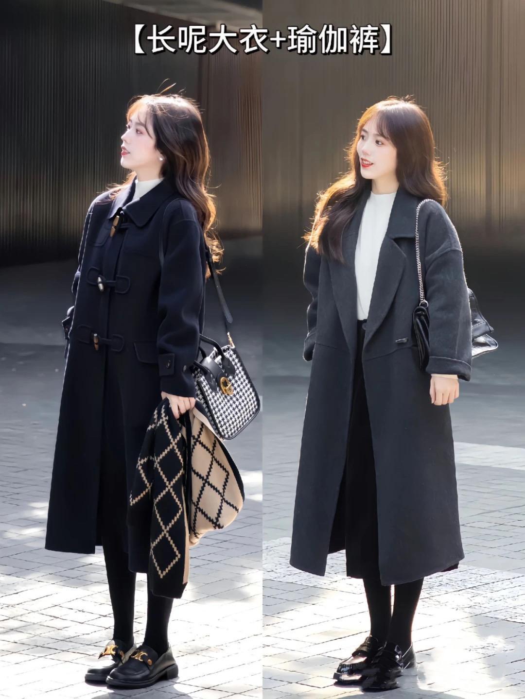 長款的呢大衣,對於小個子來講,最好是搭配緊身的鯊魚褲。鯊魚褲不像闊腿褲一樣邋遢,還可以塑造出鬆緊有度的對比。寬鬆的長款呢大衣,配上緊身的瑜伽褲,反而顯得小腿線條更加纖細。