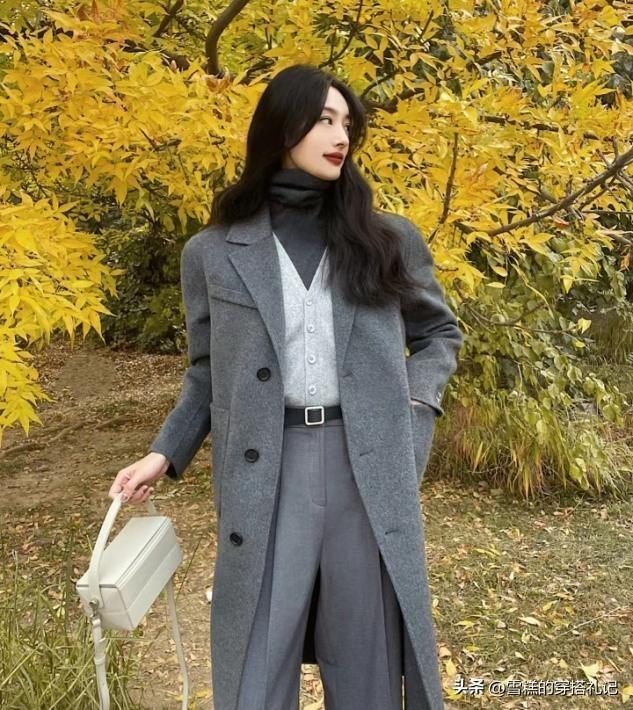 既然是一套大衣和闊腿褲,相互制衡的穿搭,那麼色彩的調節也相當的重要,以冷色調的穿法作爲推薦,會讓膚色偏黃黑的女生着裝的更加自信,黑白灰再疊加一些藍色系的着裝,看起來清冷高貴,更有一種通勤的簡約感。