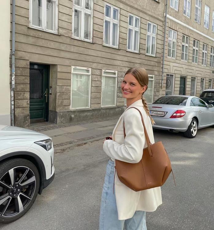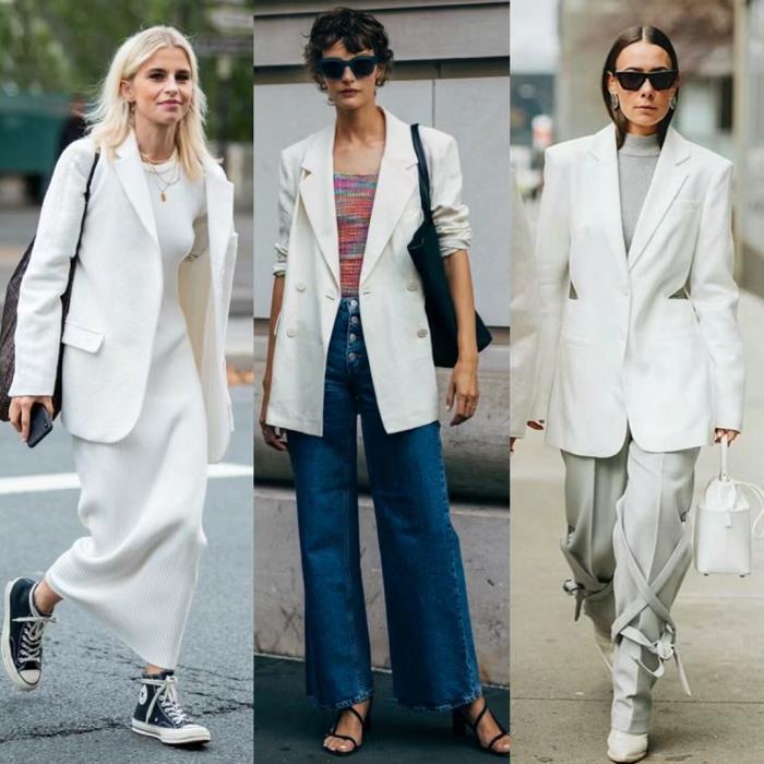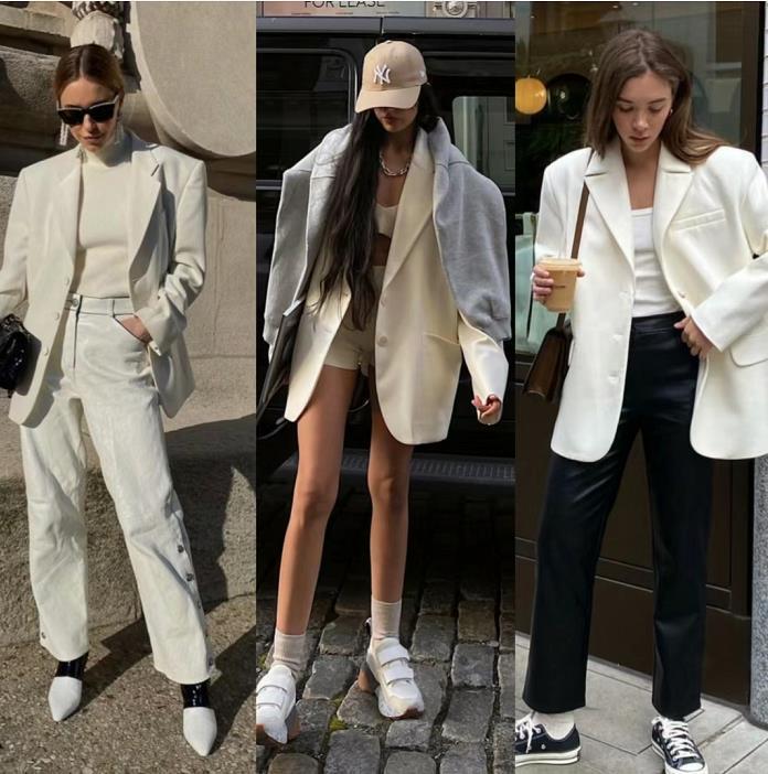 白色西裝外套+牛仔褲,挺適合上班通勤,也可以在日常逛街的時候穿,有些寬鬆版型的西裝外套,穿起來可舒適自在了。