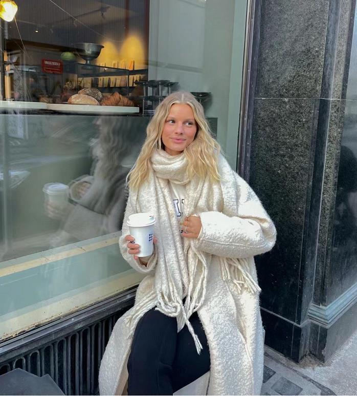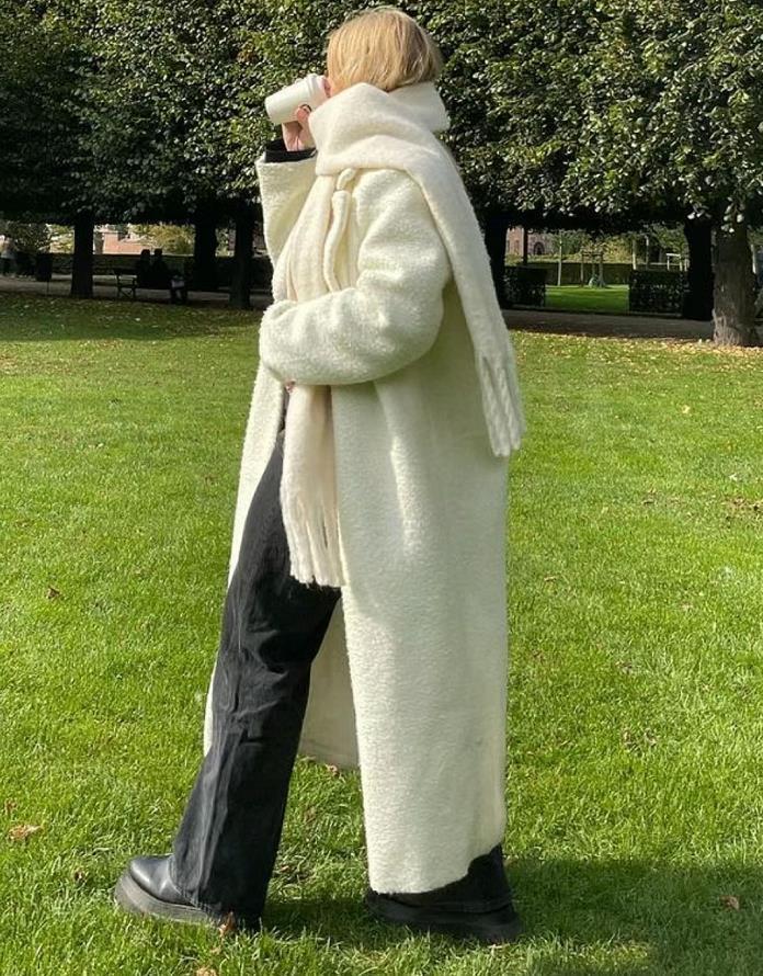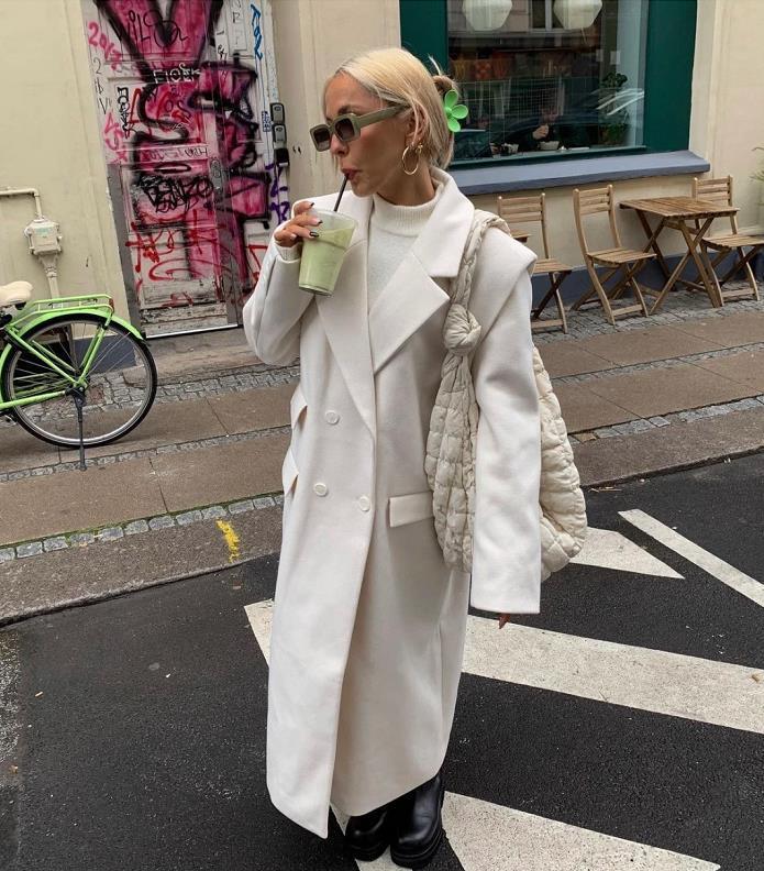 喜歡這種奶白色大衣並不是沒有理由,它沒有純白那般難以駕馭,這種色調更柔和,寬鬆的版型襯托下,舒適自在又藏肉。