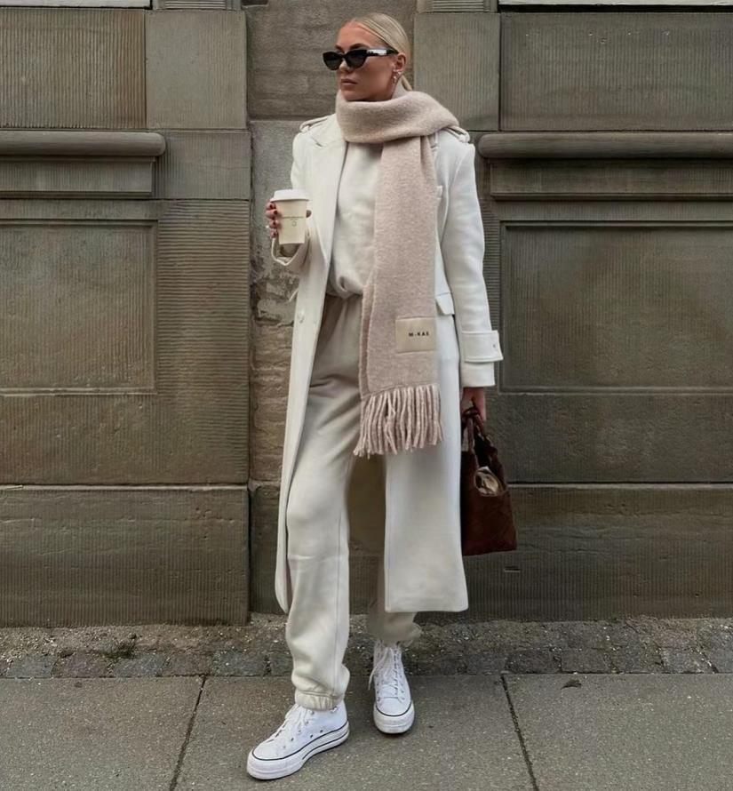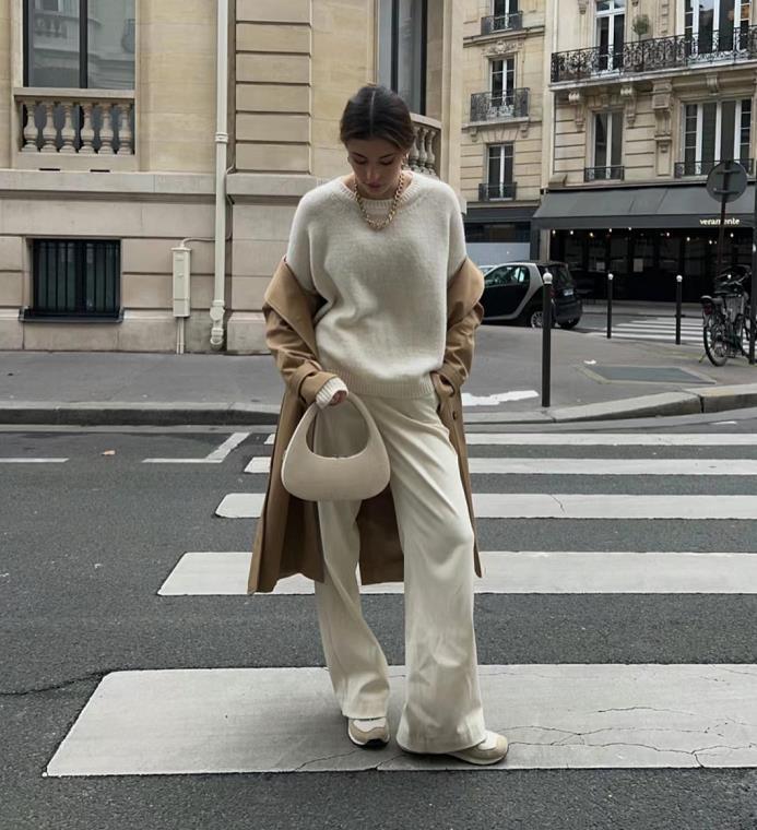 白色毛衣+白色牛仔褲,一身同色系的組合,就是有種極簡風的既視感,最重要的是不出錯。外搭卡其色風衣,看起來就很氣質。