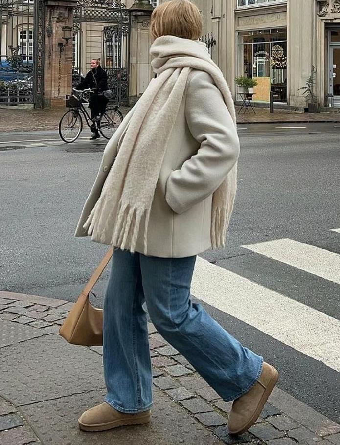 小個子女生的話,長度上就選短款吧,利落的長度,能讓你減少拖沓感,在視覺上也沒有那麼顯壓迫。搭配一條牛仔褲和一雙雪地靴,日常舒適又好看。