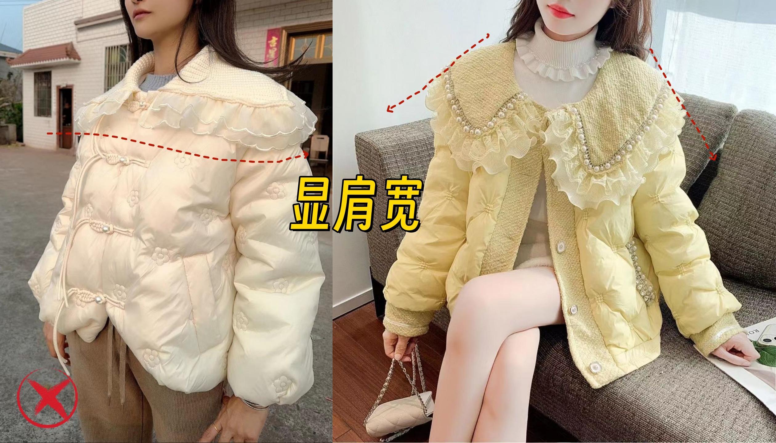 羽絨服要避雷的款式還有這種大翻領的,讓整個肩膀非常顯寬,結合針織或者其他毛領的設計,增加累贅感。
