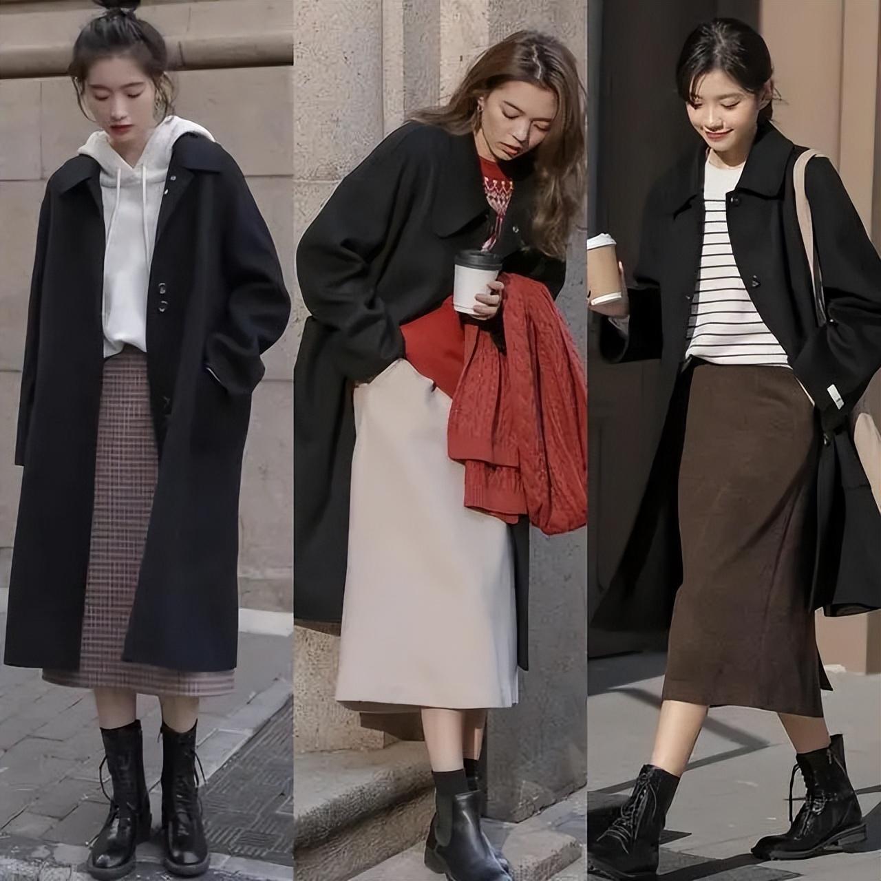 毛呢半身裙,是一種比較厚實防風的單品,面料挺闊且具備了高級感與保暖性。過膝長度的毛呢半身裙,更加溫柔顯氣質。冬季搭及踝的短靴、可以顯得雙腿纖細。