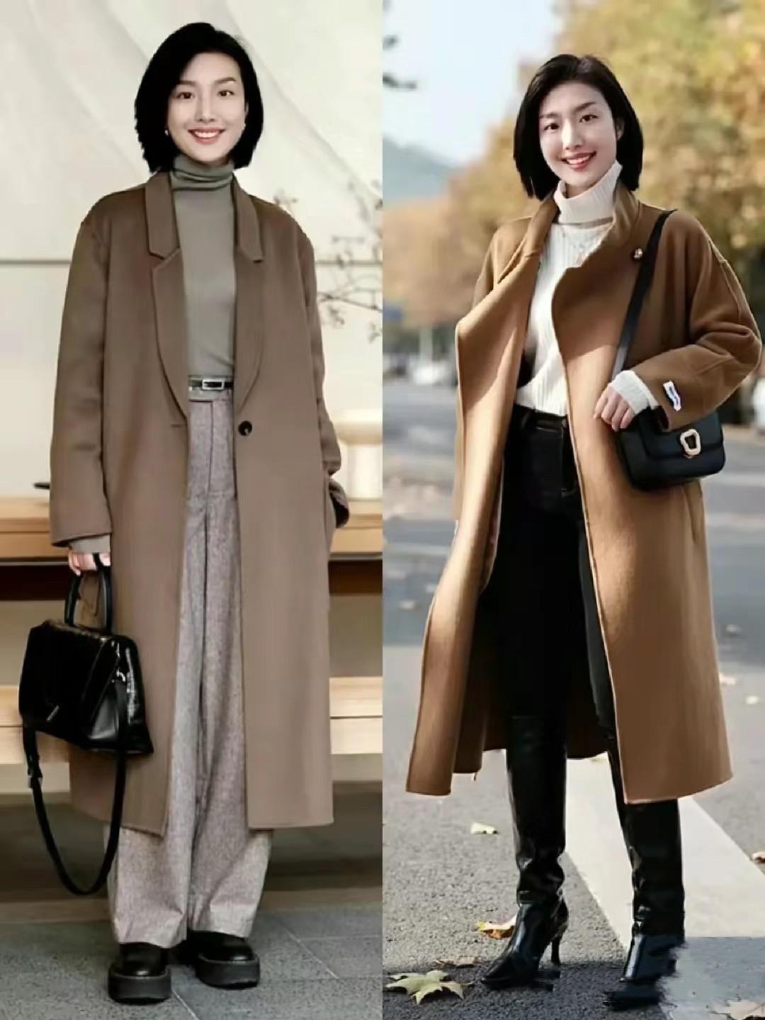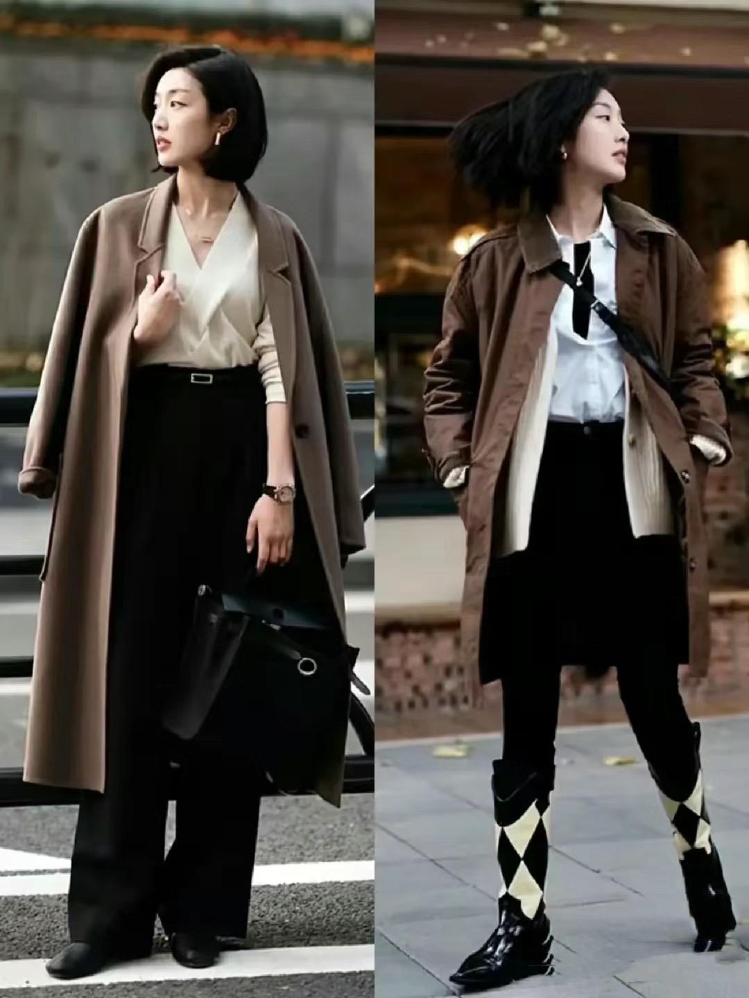 大衣+長褲,一種氣場更加強大、也透着知性成熟風格的穿搭模板。棕色系的大衣、帶着沉穩與內斂,可以從40歲一直穿到80歲,以前都不挑人的色彩百穿不膩。