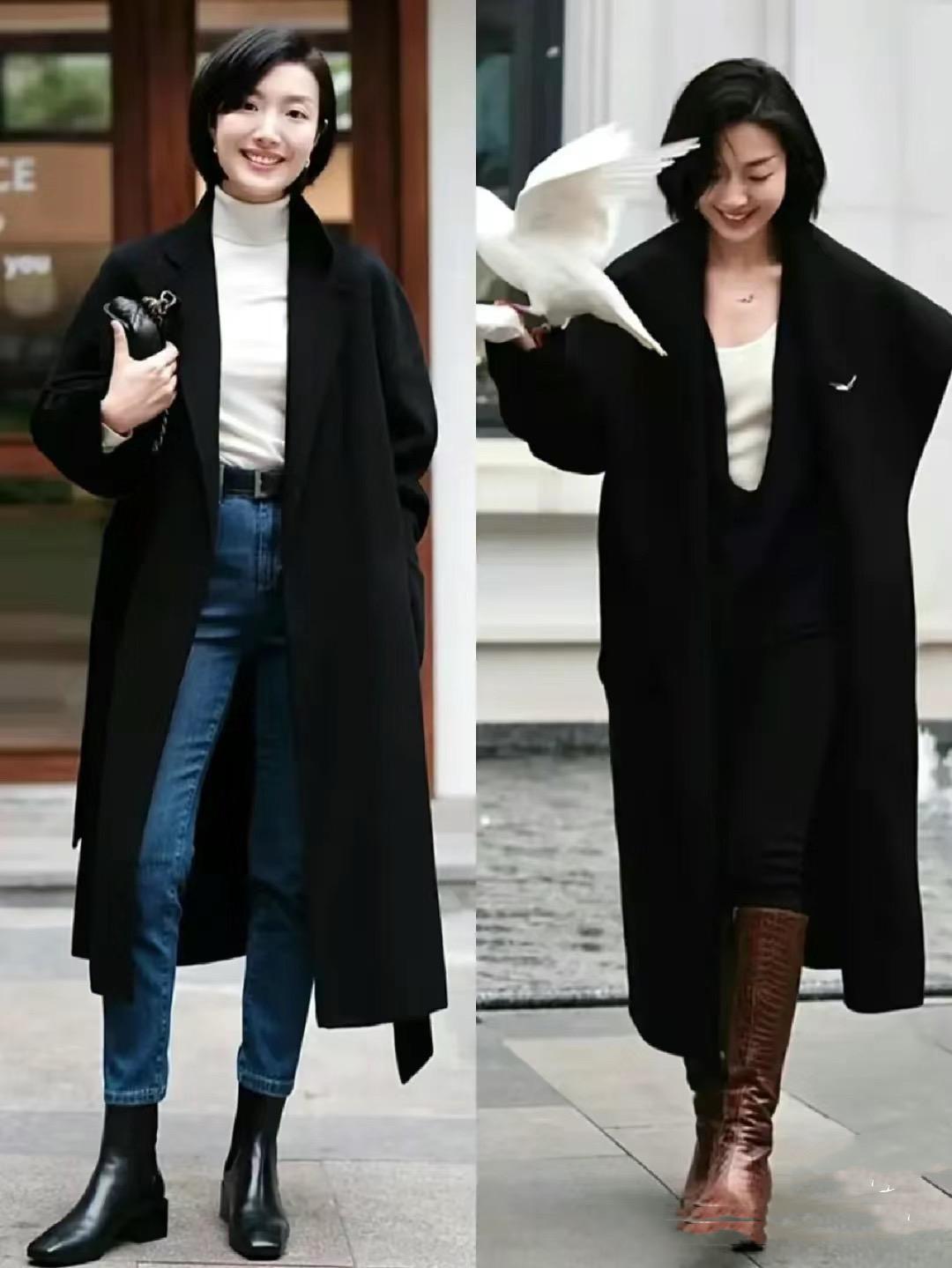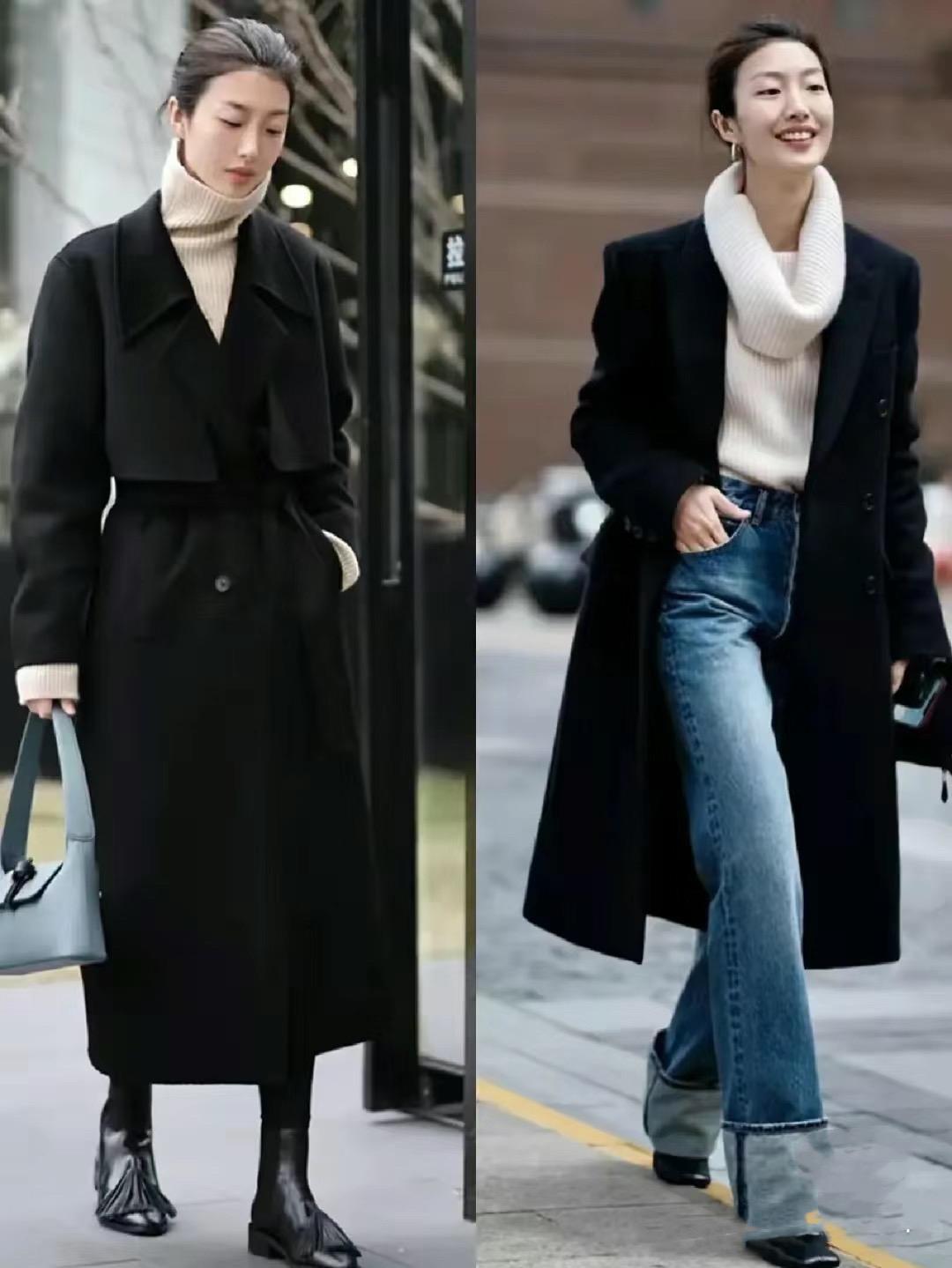 40歲女性的通勤穿搭,一定是優雅體面的。一件經典的黑色大衣,來搭配高腰的長褲,簡簡單單就寫滿了高級。