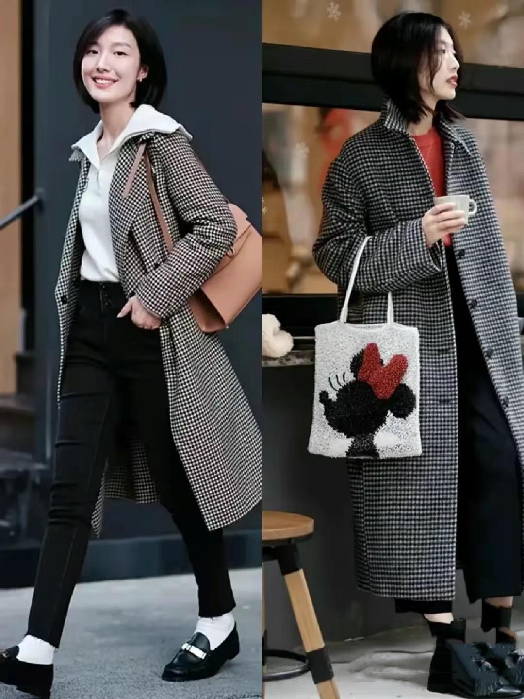千鳥格的大衣,也很容易搭配。我們可以配基礎款的打底衫、或者半拉鍊毛衣,然後隨意的搭配一條經典的小黑褲,露出腳踝的位置、還可以顯得雙腿又細又直。