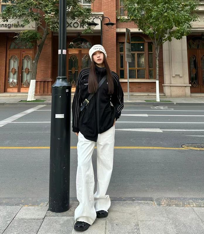 這一套真的好酷啊,回頭率很高,黑白配色組合,怎麼都看不膩,有些拖地的白色褲子,因爲版型適中,一點都不用擔心會穿出顯胖效果。