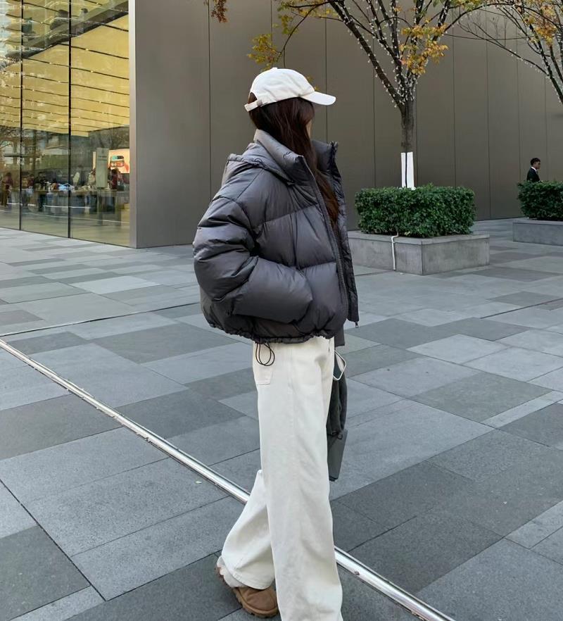 短款灰色羽絨服,這種灰色是很特別的,利落的短款,小個子女生穿上輕鬆顯高挑,也提高了腰線比例。搭配白色褲子慵懶又舒服。