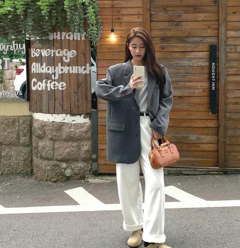 灰色西裝+白色闊腿褲,真的是yyds啊,日常很喜歡這種簡約韓系風的穿搭,不管是通勤上班,還是日常休閒都合適。舒適又好看。