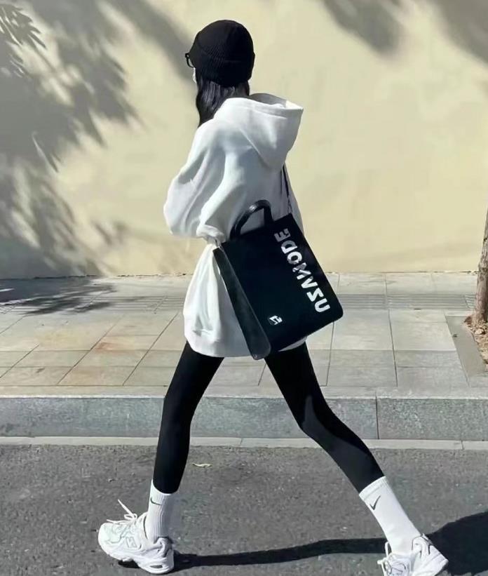 搭配白色連帽衛衣,與腳上外露出來的白色襪子、運動鞋都進行了呼應,更和諧好看了。