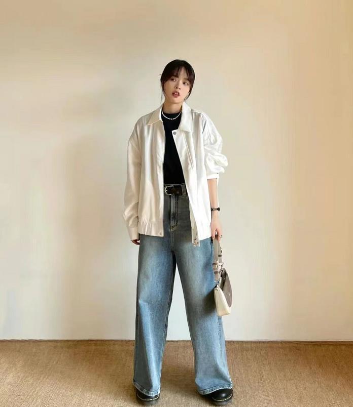 有幾分小帥氣的白色外套,春天的時候穿正好,搭配黑色打底+牛仔闊腿褲,這樣的穿搭看起來也太時髦了,記得要運用起配飾進行點綴,絕了。