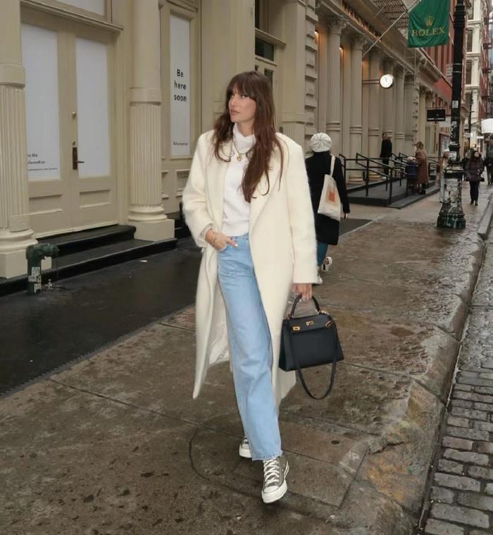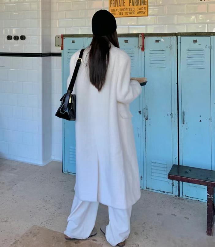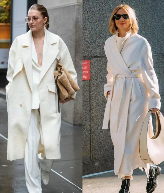在冬天,選擇白色的長大衣來穿,真的太溫柔氣質了,寬鬆的版型襯托下,很顯瘦藏肉。與白色西裝休閒褲相配,一整體白色,和諧又高級。