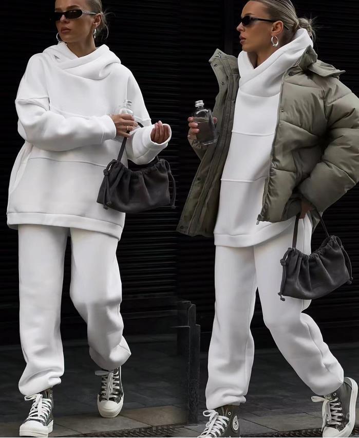 白色連帽衛衣套裝,對於懶人而言實在是太友好了,版型寬度適中,穿起來舒適自在又顯瘦。外搭各種大衣,或者是羽絨服都是可以的,北方的姐妹選羽絨服最合適。