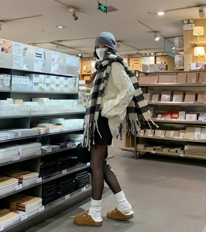 搭配黑色半裙+絲襪,莫名就多了幾分小性感,利用白色襪子外露出來,營造了層次感還時髦。