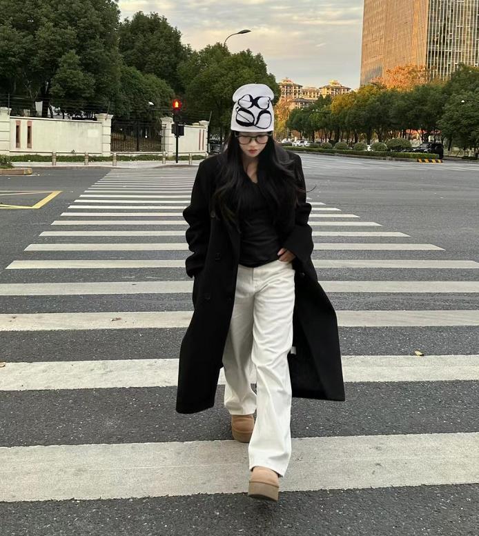 黑白穿搭就是主打一個不過時,白色褲子配黑色正肩長大衣,絕了!腳下一雙厚底雪地靴,今年很流行這種靴子,穿起來舒適又顯高。