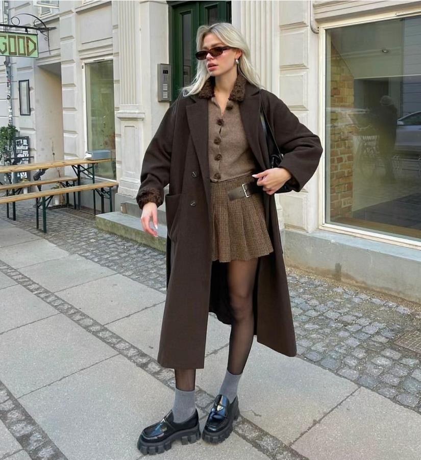 深咖色長大衣+短百褶裙,腳下一雙黑色厚底樂福鞋,這種長短組合的穿搭,看起來就很顯身材,可以輕鬆提高身材比例,以及打造出大長腿的效果。