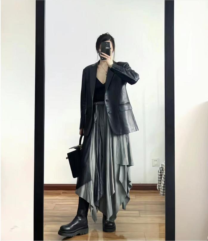 黑色皮衣+不規則半裙+中筒靴,也太絕了吧,這種自帶酷帥感的皮衣,今年也成爲了流行款,與不規則半裙相配,個性感十足。