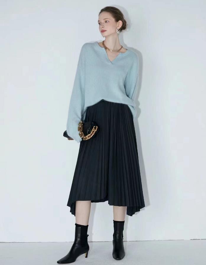 黑色百褶半身裙,這個顏色就是經典百搭,裙襬不規則的設計,彰顯出個性與時髦。腳下的細高跟及踝靴,與裙子顏色一致,不經意間就拉長腿部線條。搭配淺藍色毛衣來配,很襯膚色和顯白。