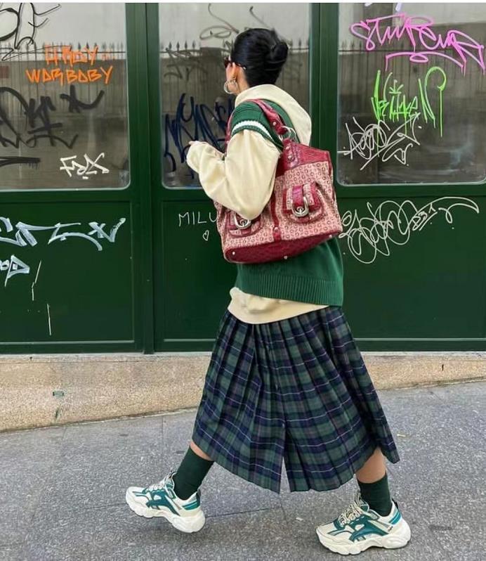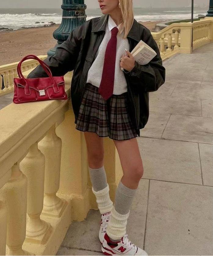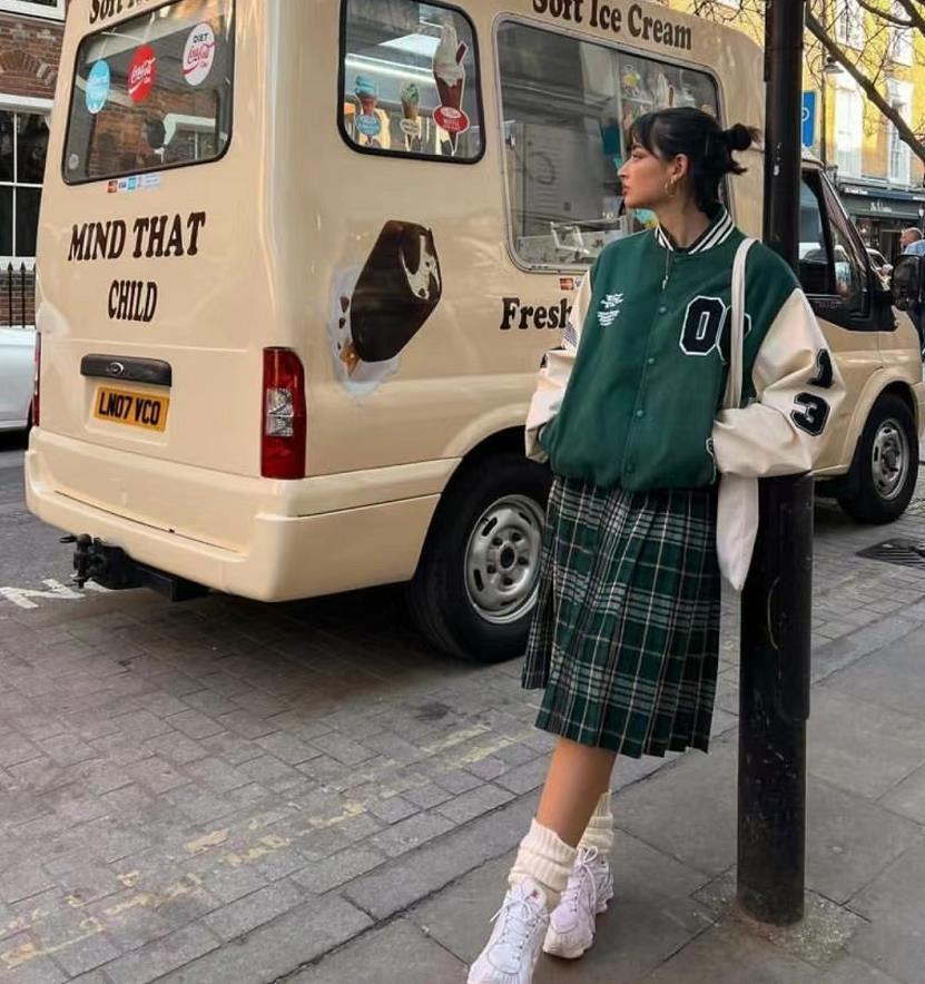 融入一點格紋元素的百褶裙,就是自帶一種復古氣息,選擇棒球服外套來配,再搭配一雙白色球鞋,瞧瞧,學院風氣息是不是被拉滿了呢?