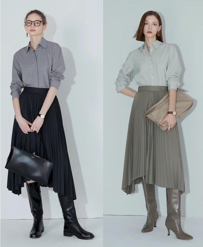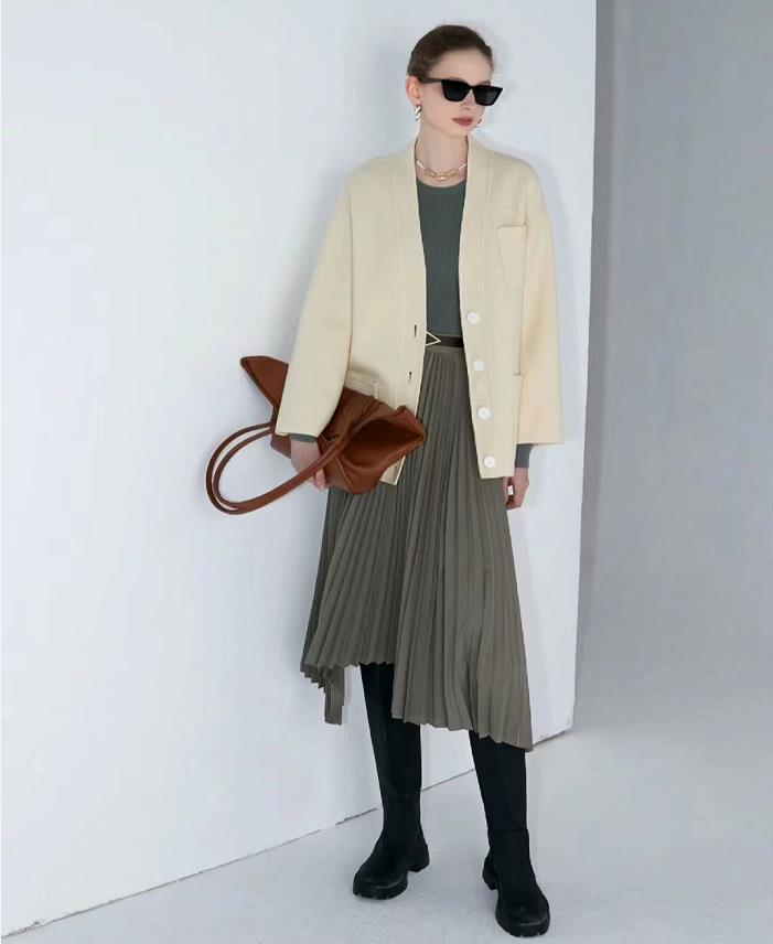高腰百褶不規則半裙,搭配長靴,這樣的穿搭在秋冬裏也不會覺得寒冷,出門的適合再加上一件長大衣或外套就可以。