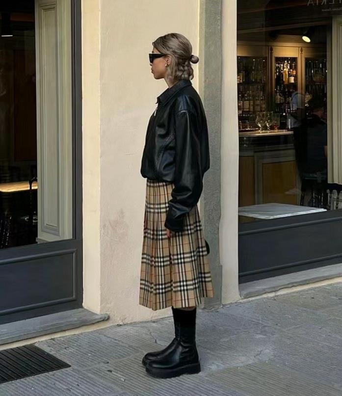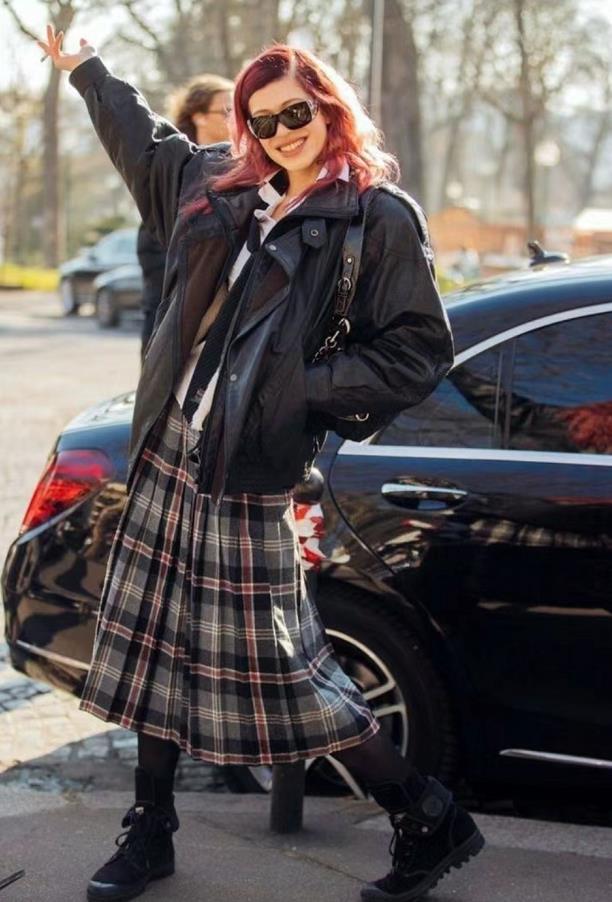 經典的格紋元素,就是能給人時髦的感覺,百褶半身格紋裙,結合起皮衣外套來配,既不失復古範,又很顯酷帥感。