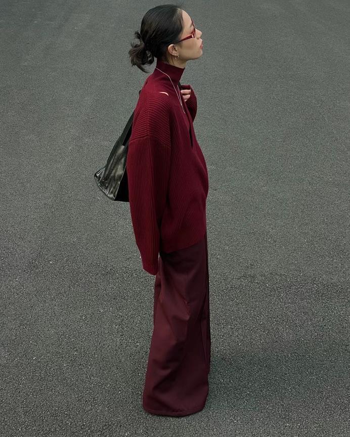 毛衣+闊腿拖地褲,上下的顏色都一致,和諧又高級。